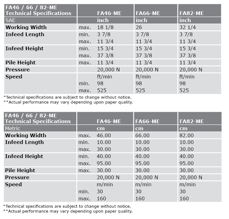 Because of independent self-control, this unit can be used in a wider range of confi gurations including lines with older machines or machines from other suppliers. As with all MBO machines, the FA Series deliveries were designed to handle product ergonomically and effi ciently at high-speeds.